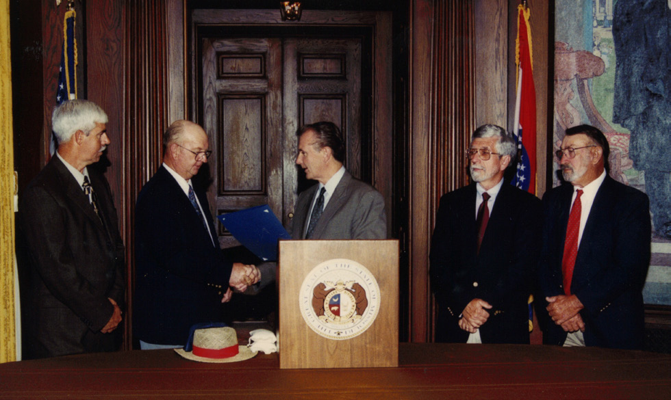 Missouri Rice Council Board members from left are BJ Campbell, Larry Riley, Missouri Governor Mel Carnahan (center), Gary Murphy and Sonny Martin at the state capitol during National Rice Month in 1999.
