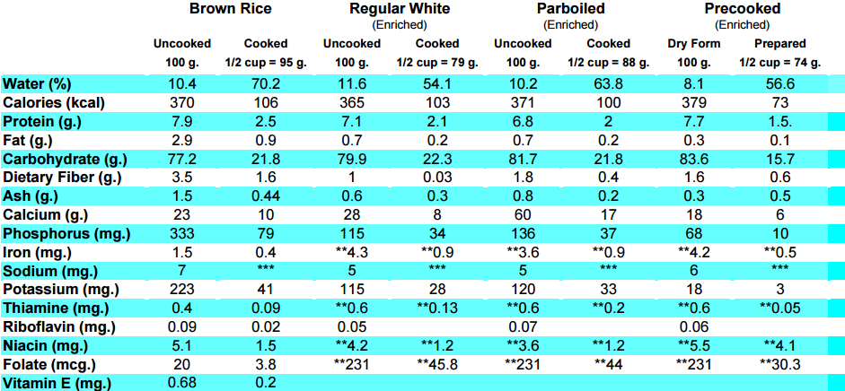 Data for cooked rice was based on results of yield test study conducted by USA Rice Council, 1991.