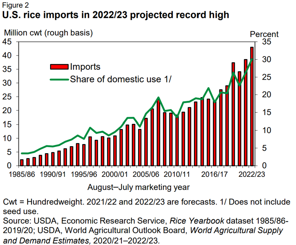 It is encouraging to see Iraq hold up to its end of the MOU with the U.S. despite prices being nearly double that of competing origins. Iraq has confirmed that they will complete their MOU with the United States and have purchased an additional 44,000 mt of US long grain milled rice with scheduled delivery in November. This will help stabilize the milling schedule in Arkansas, but the announcement of the business wasn’t enough to put upward pressure on the futures market after last week’s supply and demand report. Stocks for long grain bumped 500,000 cwt, production bumped 400,000 cwt, and ending stocks jumped by 1.8 million cwt. The announcement of the Iraqi business came at a perfect time to balance out these supply-side increases. The USDA’s July Rice Outlook raised its 2021/22 import forecast to a staggering 38.5 million cwt. That is a 13% increase in a year. Long grain increased 15% to 31.5 million. This puts imports at 30% of the U.S. domestic consumption. This is not what U.S. farmers like to hear.