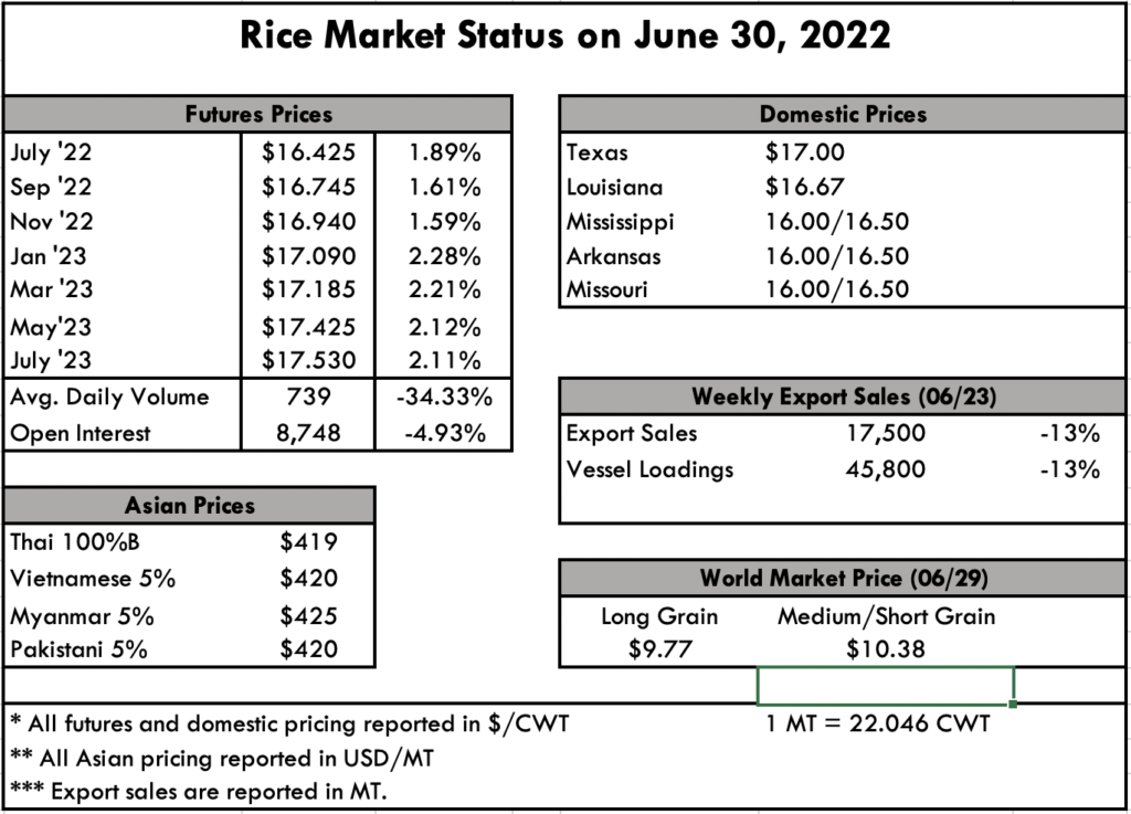 The market continues to plod along, but this week with a shot in the arm from the USDA planted acres and rice stocks reports. As all expected, acres were down from last year, registering in this report total drop of 189,000 acres, split 70,000 acres of long grain and 106,000 acres of medium grain. This is perhaps less than some were expecting, so at this point we will keep an eye on weather to determine how much of the planted crop makes it to a healthy harvest. To that point, higher than normal temperatures in Texas are stressing the rice crop already, causing crop experts to warn of lower yields. The triple digit temps on the backs of a drought are not boding well for a strong crop at this point.