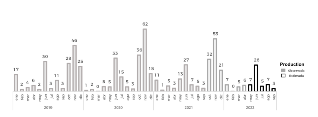 Until April 30, 2022, in the 2021/2022 Fall-Winter cycle, 19% of the planted areas had been harvested obtaining 16,562 MT of paddy rice equivalent to 10,898 MT of white rice, with the State of Michoacan, contributing with 78% of the harvest so far.